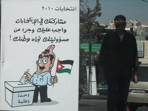 One of their posters provoked controversy regarding the government's intention in its use. It depicts a well-known Jordanian caricaturian character casting his ballot in a "national unity" ballot box.