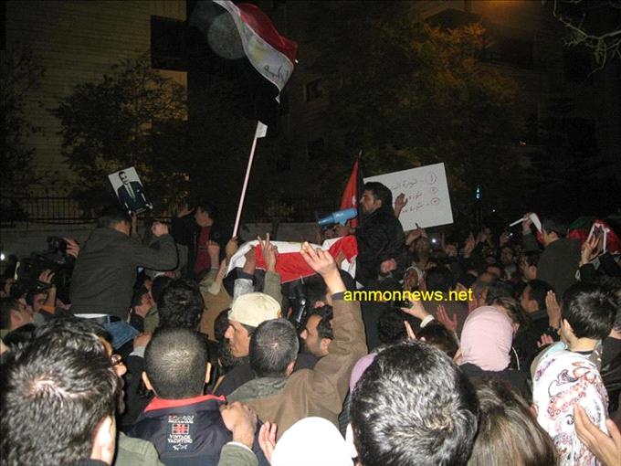 Crowds estimated in the thousands crowded in front of the Egyptian Embassy in Amman, launched fireworks, and called on Arab leaders to listen to the demands of their peoples.