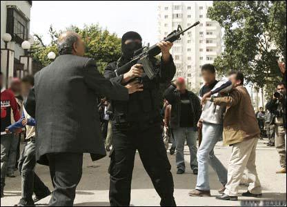 According to eyewitnesses a black car without license plates blocked the street and a group of masked armed men around the vehicle shot bullets in the air and prevented vehicles from crossing the road.