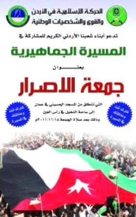 The protest will be Under the banner “ Friday of Insistence” the mass rally will march from Al Husseini Mosque downtown Amman following Friday midday prayer, marching towards Al Nakhil Square in Ras El Ain calling for genuine political reforms.