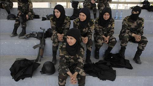 Ammon News - AP - Palestinian women in combat fatigues and headscarves rappelled down a six-story tower, fired assault rifles at imaginary terrorists and in a drill straight out of the movies bundled a would-be VIP into a car and sped off after a shooting.