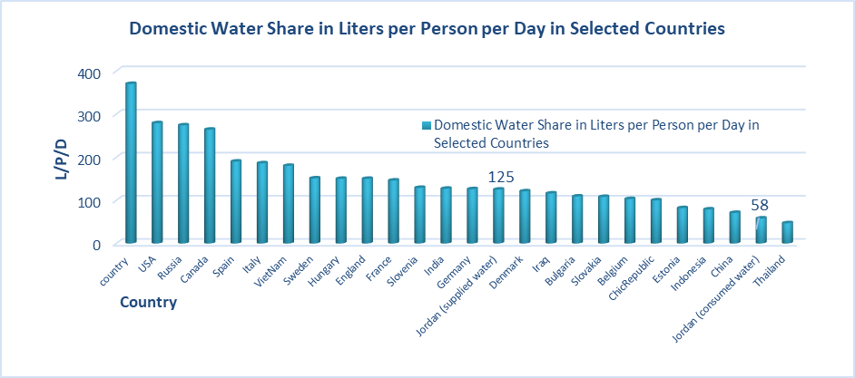 Jordan is an example of a developing nation living in a severe water crisis and striving to develop strategies to reduce the severity of the problems that is facing because of this multifaceted water crisis that impacts water supply and quality throughout the country. The Jordanian population reached on 3/11/2021 according to DOS (2021) 11,022,740 inhabitants (Jordanian and non-Jordanian) with a population density of around 124.06 for each square kilometer, with total land area equal 88849 km2. The growing water crisis puts Jordan's population among the most water-deprived in the world, with a current water supply of only 145 m3/person/year that is projected to fall to only 91 m3/person/year by 2025 (MWI 2016). According to the Jordanian Ministry of Water and Irrigation (Water Reallocation Policy report) MWI (2016) and recent official water figures and numbers from the Ministry of Water and Irrigation (WIS 2020) the domestic water share in liters per person per day is 125.5 (Per capita of supplied water (l/day)) (Figure 1). While water billed in villages and cities in Jordan indicates that about 76 % of customers consume less than 80 l/day and 85 % consume less than 100 l/day.