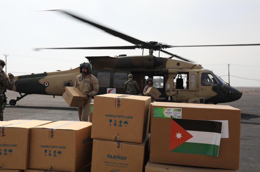 Ammon News - The Jordanian Armed Forces (JAF)- Arab Army continue to send humanitarian and relief aid via air bridge aircraft to the Gaza Strip from King Abdullah II Air Base through 16 helicopters carrying 20 tons, in cooperation with the Jordan Hashemite Charity Organization (JHCO) and a number of brotherly and friendly countries.