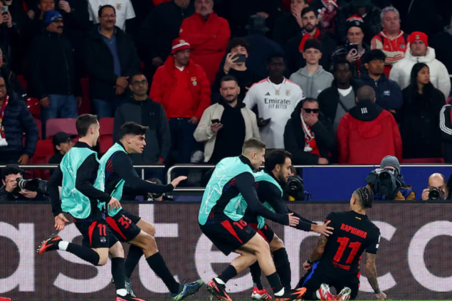 Ammon News - Raphinha struck a second-half winner to give Barcelona a lion-hearted 1-0 victory at Benfica on Wednesday as they overcame a red card for Pau Cubarsi early in the game to steal an advantage in the first leg of their Champions League last-16 tie.