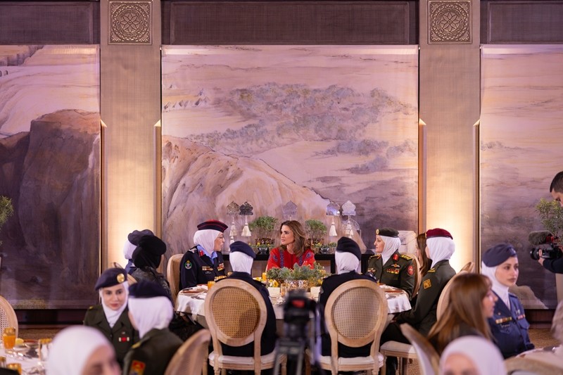 Ammon News - Her Majesty Queen Rania Al Abdullah hosted a group of female members of the Jordanian military and security agencies for Iftar on Wednesday at Al Husseiniya Palace in Amman.