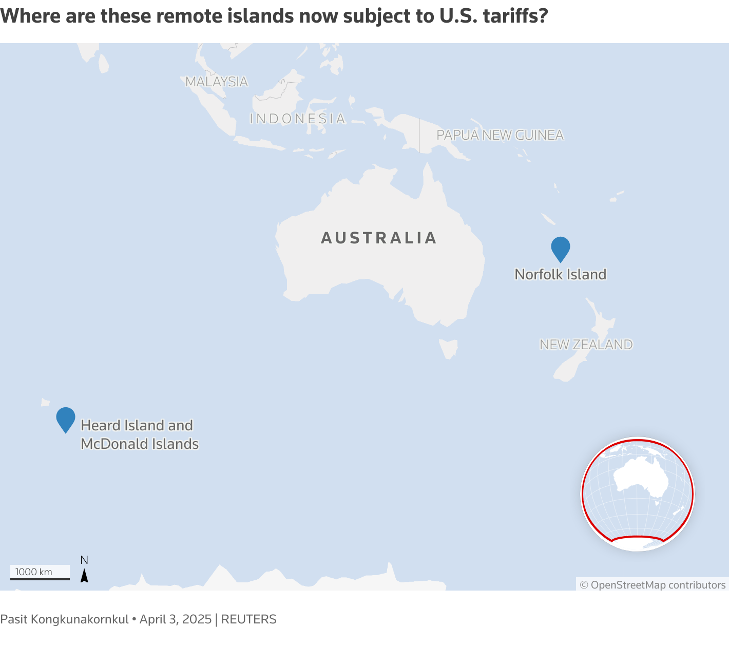 Some, like the Heard and McDonald Islands in the Antarctic, which like Norfolk Island is overseen by Australia, did not even have human inhabitants. No matter - as of Thursday, they faced a 10% tariff for exports to the U.S.