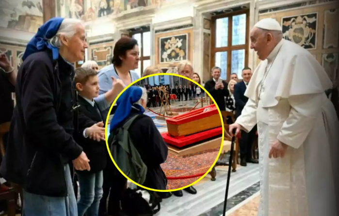 The image of an octogenarian nun, with a green backpack on her shoulder, approached the Pontiff's coffin, breaking the strict Vatican protocol to pray and cry in silence.