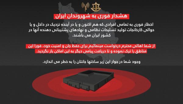 In a warning in Arabic as well as in Persian, on his X account, Adraee said: "Urgent warning to all Iranian citizens: All persons who are currently or in the near future present in or around military weapons production factories and their support institutions should immediately leave these areas and not return until further notice. Your presence next to this infrastructure puts your life at risk."