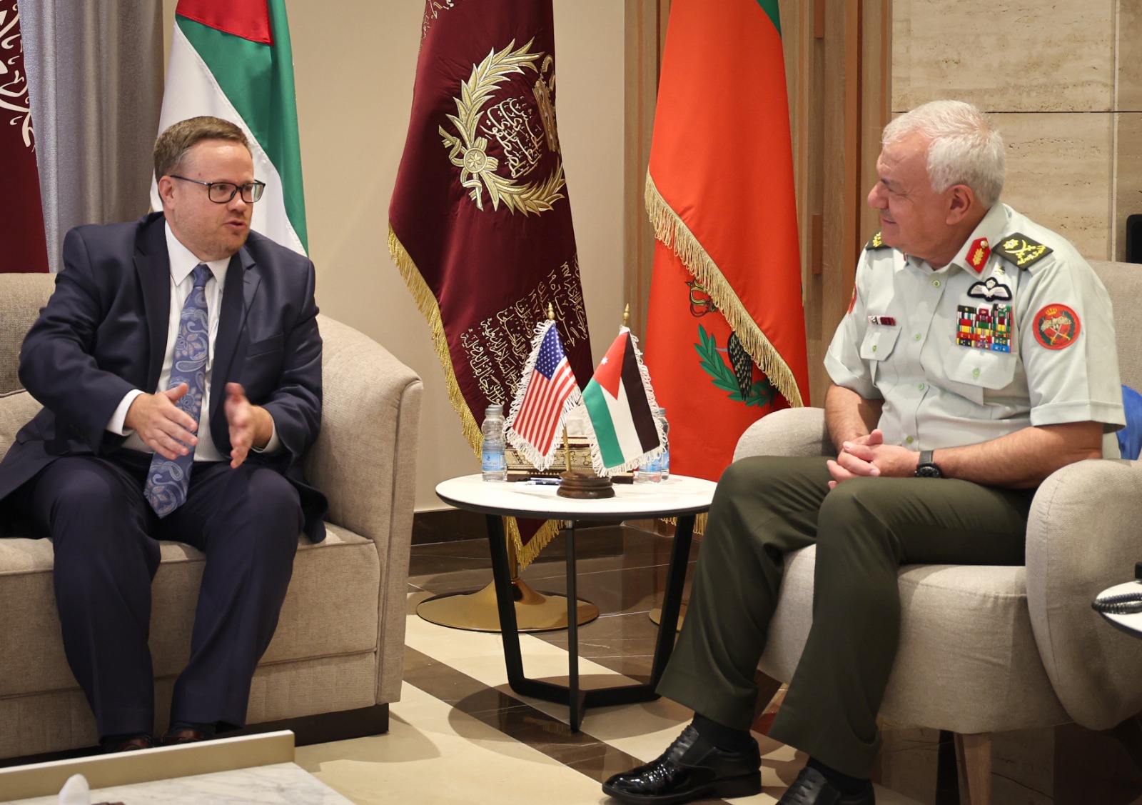 Ammon News - Chairman of the Joint Chiefs of Staff, Maj. Gen. Yousef Ahmed Al-Hunaiti, met on Monday with U.S. Charge d'Affaires Peter Shea at the General Command headquarters in Amman to discuss ongoing military cooperation between Jordan and the United States.