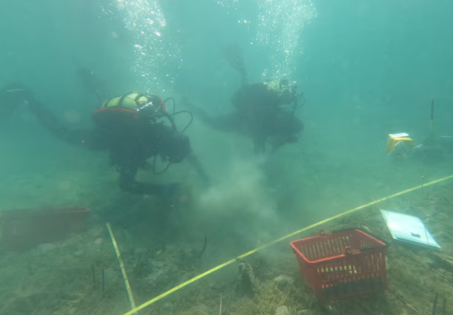 The team, from Switzerland and Albania, spends hours each day about three metres (9.8 feet) underwater, painstakingly retrieving wooden stilts that supported houses.