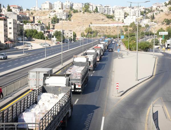 Ammon News - A new Jordanian convoy of 38 aid trucks crossed Monday into the Gaza Strip, dispatched by the Jordan Hashemite Charity Organization (JHCO)