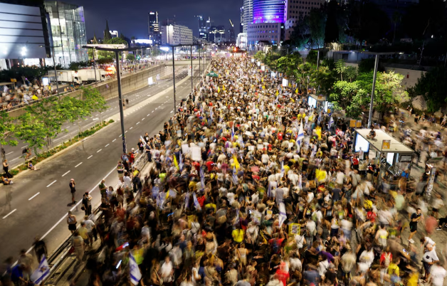 Ammon News - Thousands of protesters took to the streets of Tel Aviv on Saturday night to oppose Prime Minister Benjamin Netanyahu's plan to escalate the nearly two-year Gaza war, demanding an immediate end to the war and for the release of the hostages.