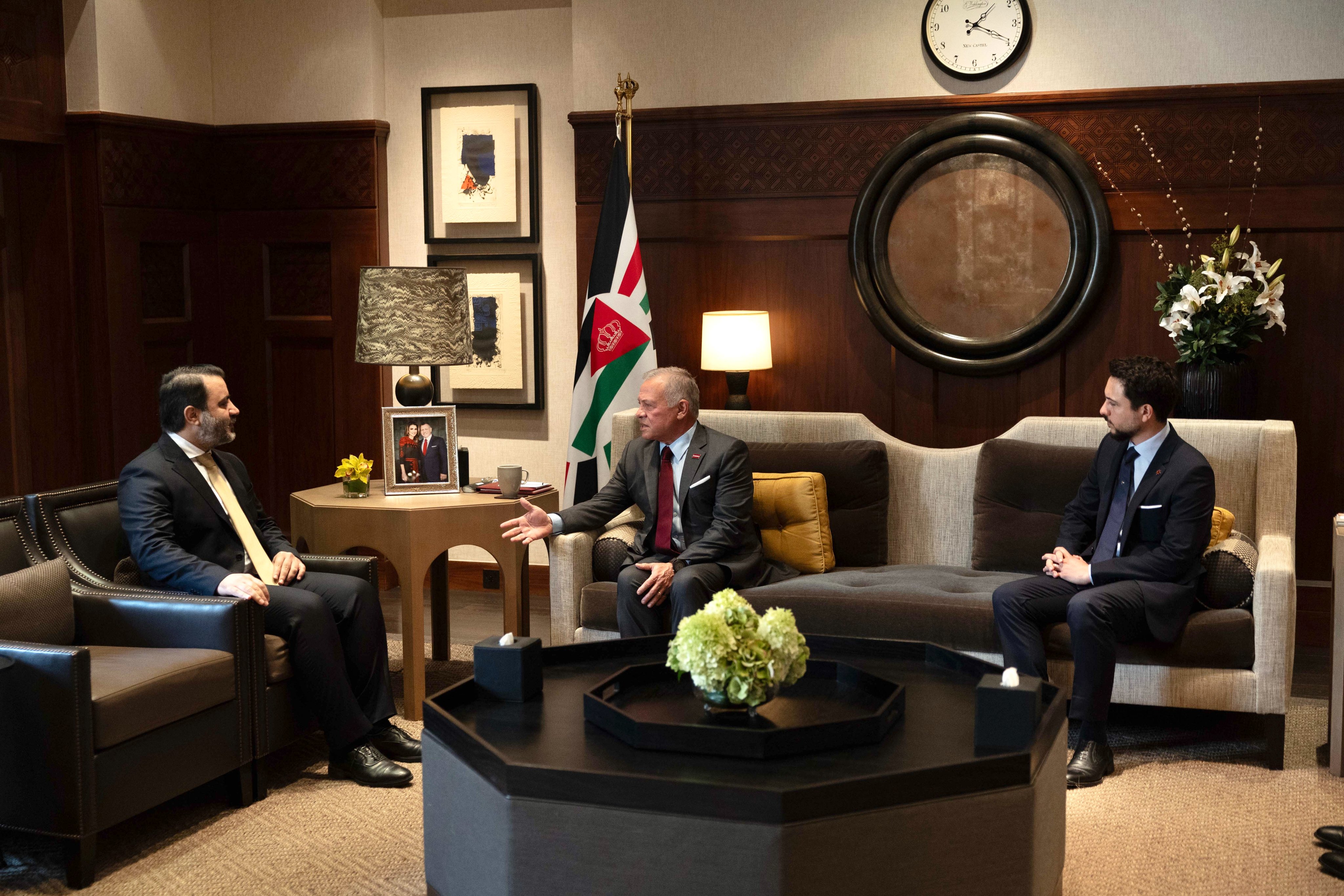 Ammon News - His Majesty King Abdullah II held two separate meetings on Tuesday with Syria’s Foreign Minister Asaad Al Shibani, and United States Ambassador to Türkiye and Special Envoy for Syria Thomas Barrack, to discuss the latest developments in Syria.