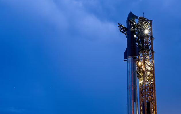The 232-foot(70.7-meter)-tall Super Heavy booster and its 171-foot(52-meter)-tall Starship upper half sat stacked on a launch mount at SpaceX's Starbase rocket facilities as it was being filled with propellant ahead of a liftoff time of 7:35 p.m. ET (2335 GMT).