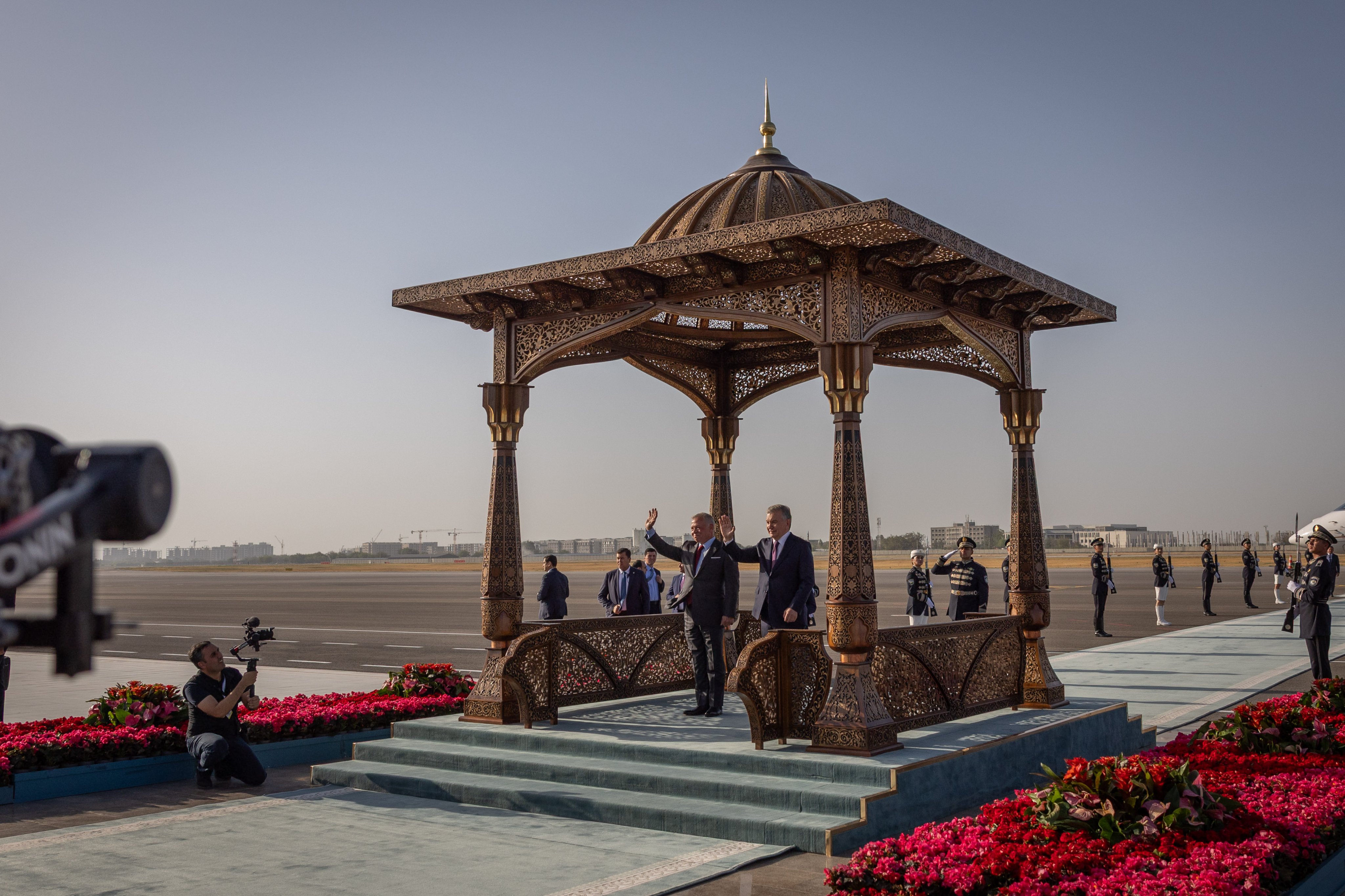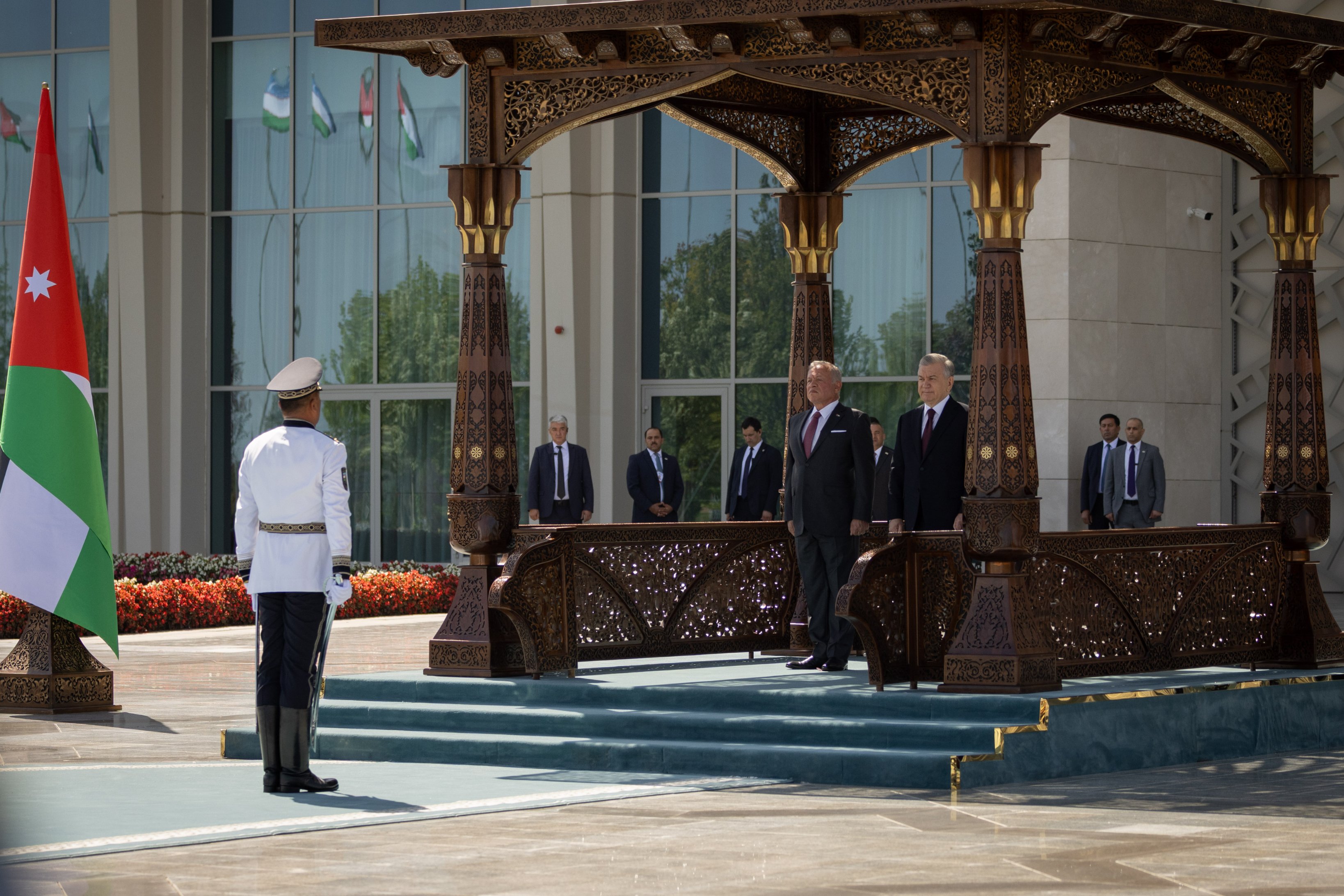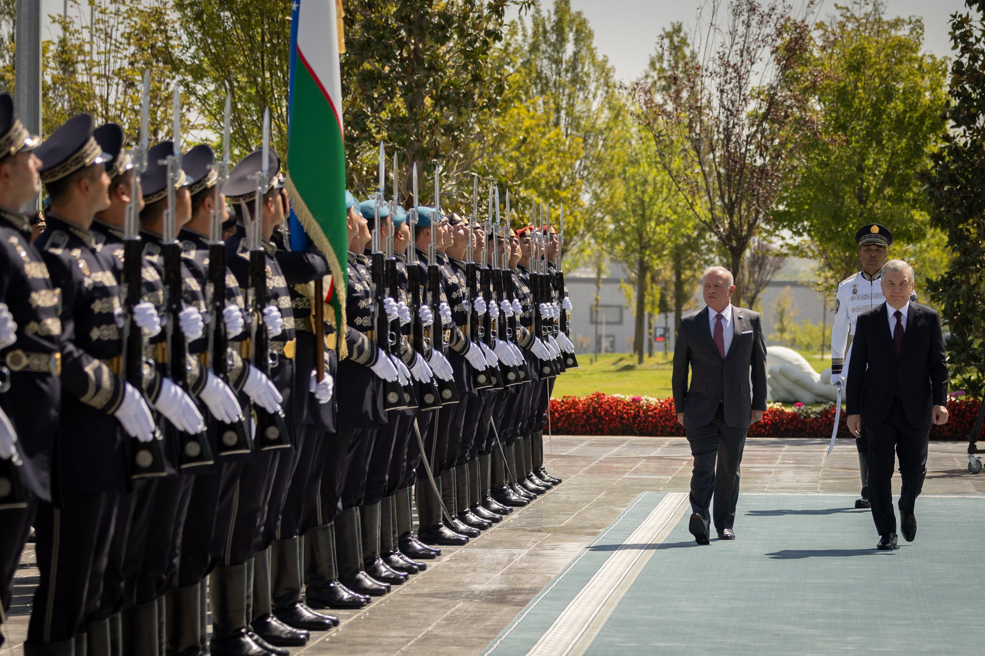 Ammon News - On August 25, 2025, His Majesty King Abdullah II started a state visit to Uzbekistan, and welcomed by Uzbekistan President Shavkat Mirziyoyev during a welcoming ceremony at Samarkand International Airport.