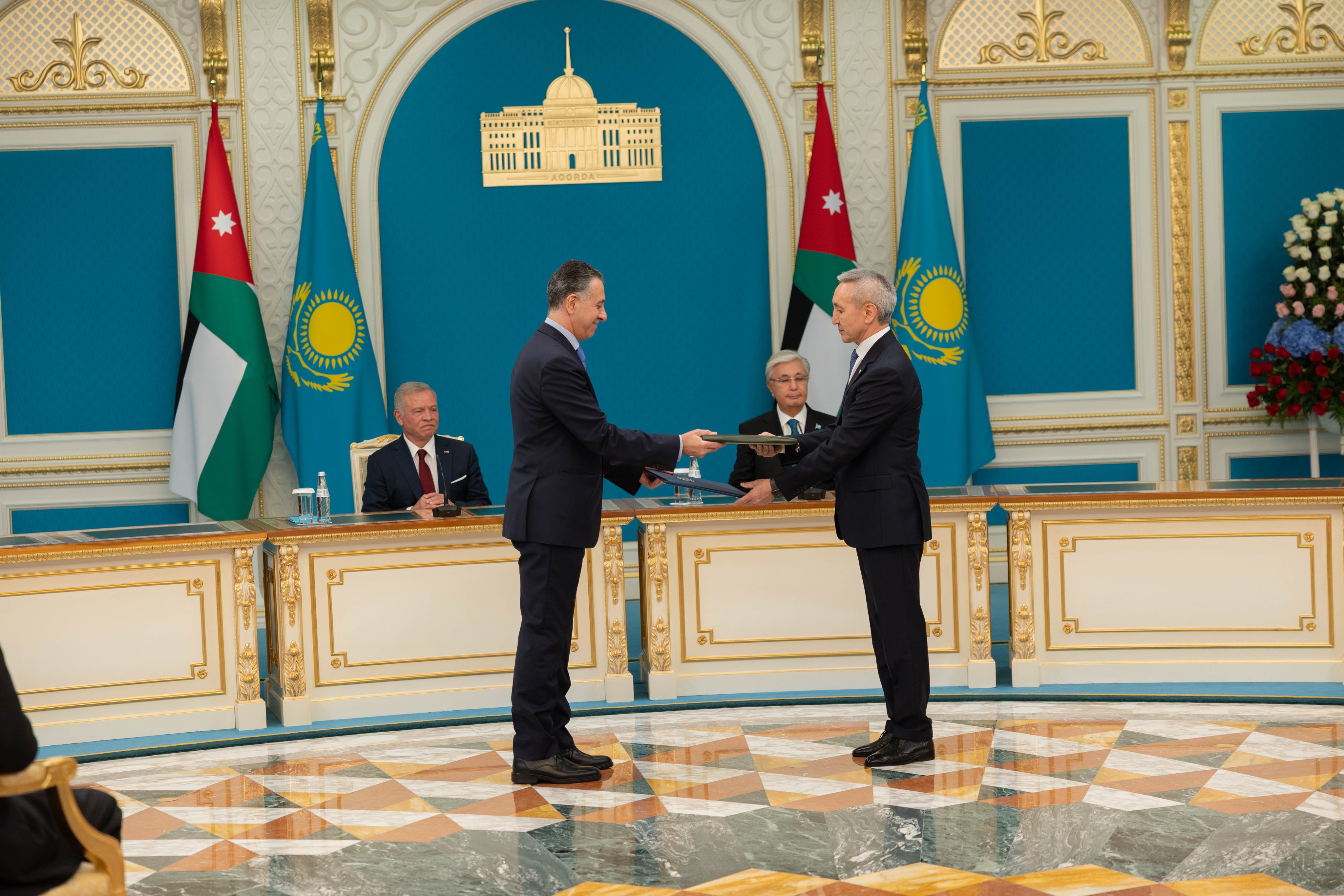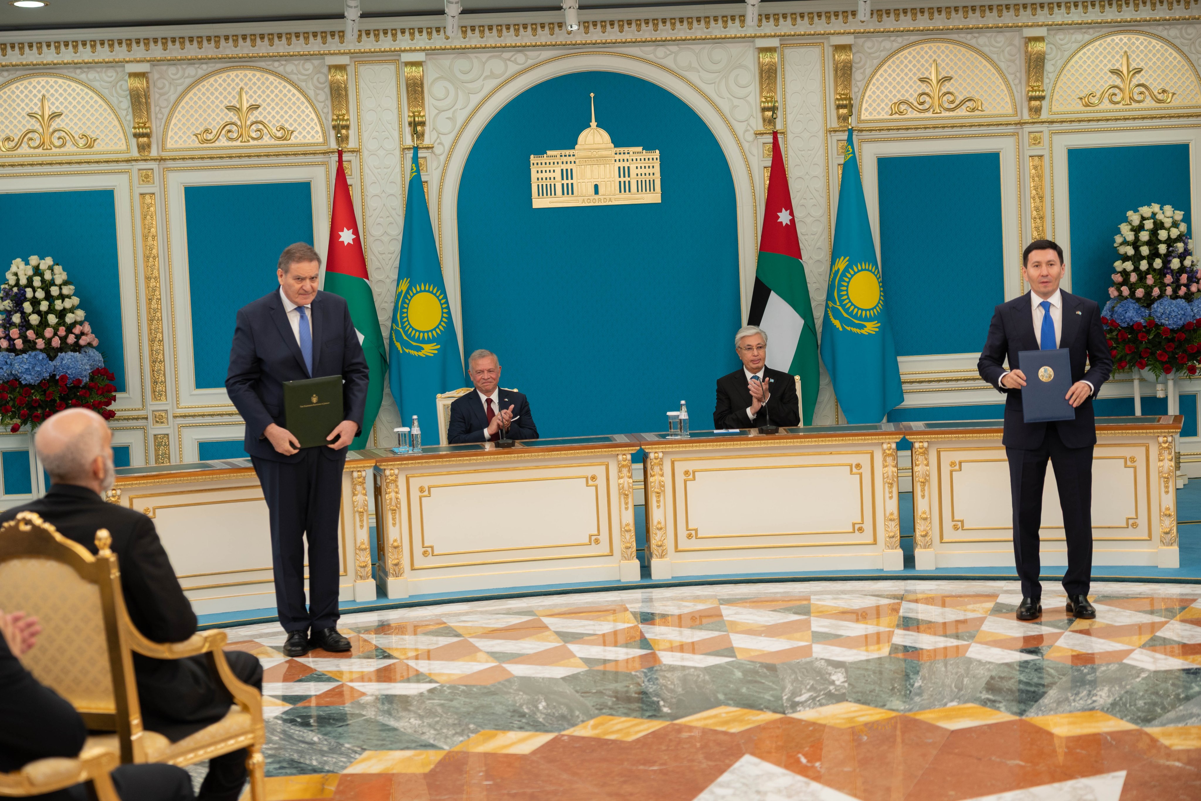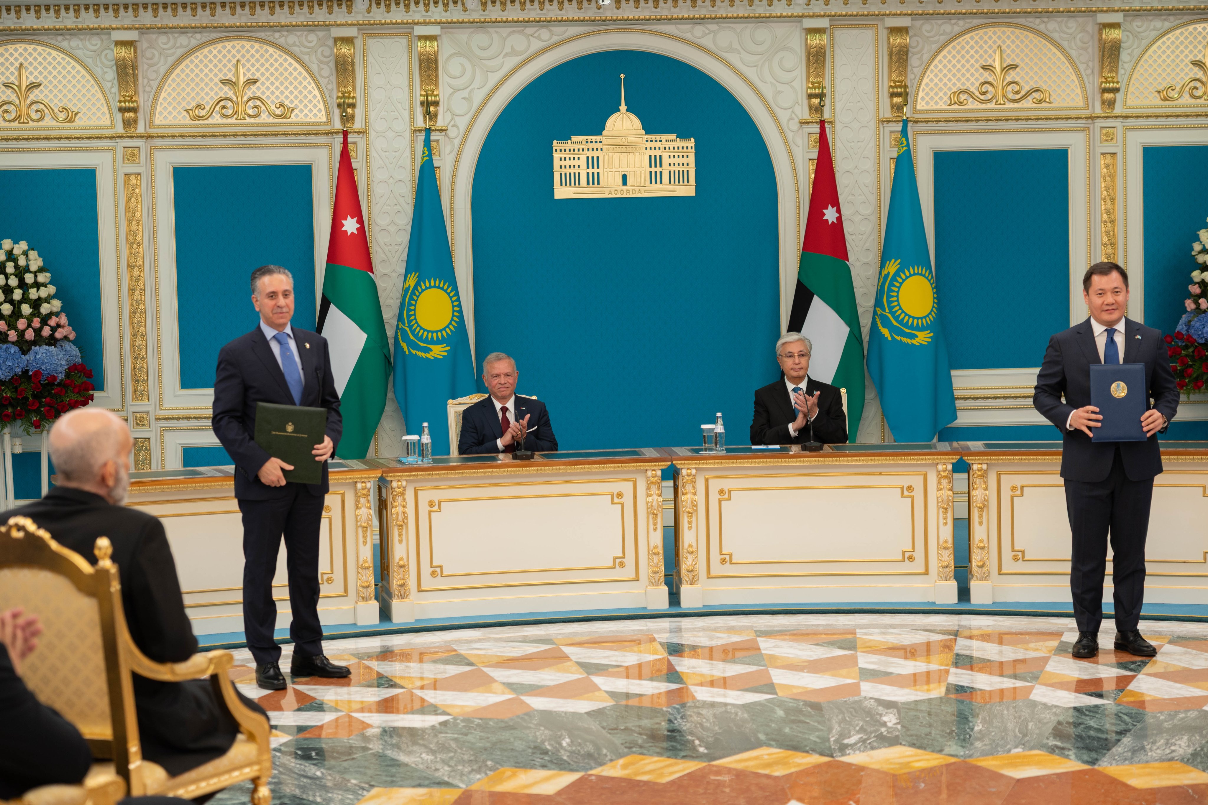 His Majesty and President Tokayev witnessed the exchange of three cooperation agreements and three memorandums of understanding between the governments of the two countries in the fields of maritime transport, healthcare, standards and metrology, nuclear energy and uranium mining, entrepreneurship, and archiving.