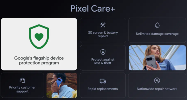 The new program includes unlimited claims for accidental damage, extended warranty claims, and mechanical damage. It also comes with $0 screen and battery repairs, $0 post-warranty malfunction claims, genuine Google parts and replacements, priority support from Pixel experts, self-service claims through the Google Store website, and optional added loss and theft coverage.