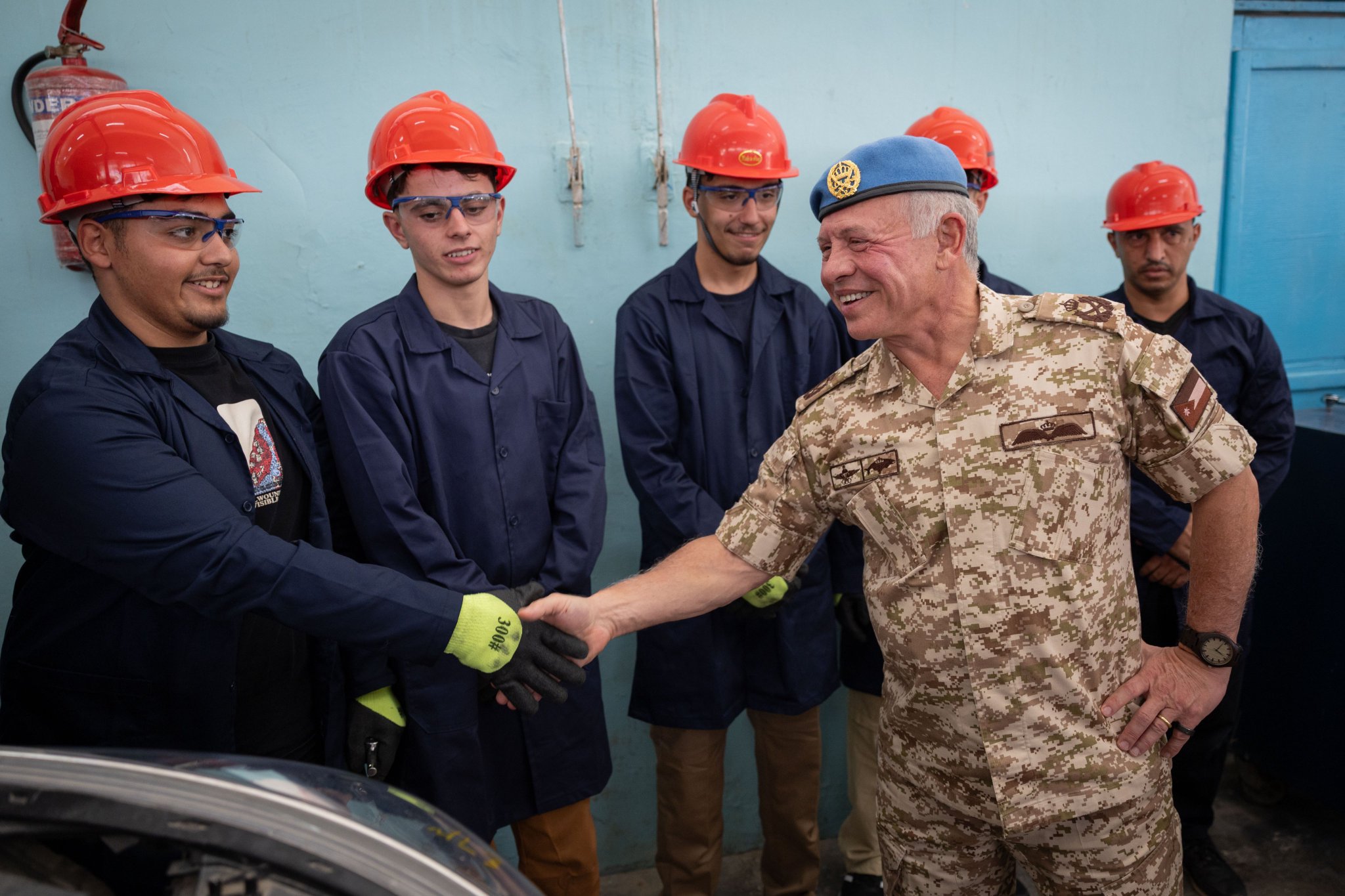 The King, accompanied by His Royal Highness Crown Prince Al Hussein bin Abdullah II, toured the school’s workshops and was briefed by the principal on the school’s methods for implementing vocational education and training programmes, in areas such as carpentry, automotive mechanics, air conditioning, and refrigeration.
