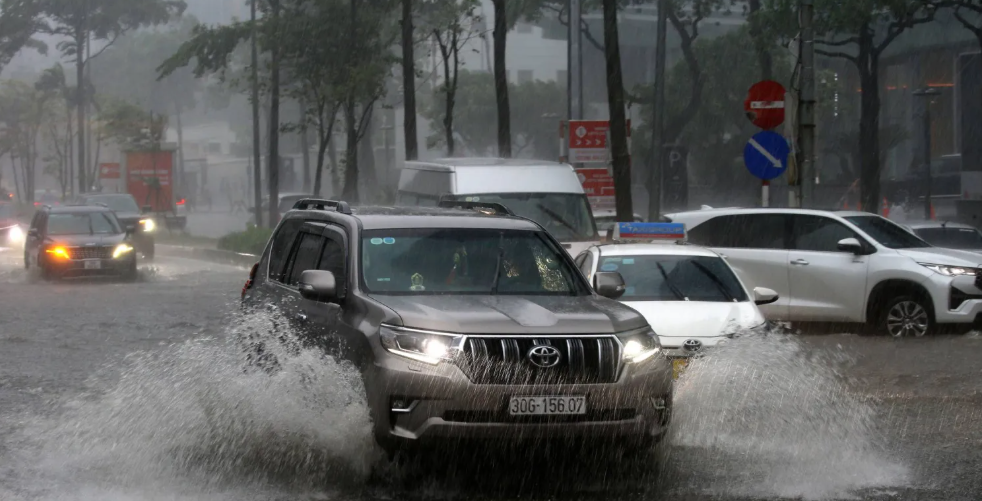 Thunder and lightning accompanied persistent downpours that flooded streets in downtown Hanoi and paralyzed traffic in many areas. Photographs on state media showed cars and motorbikes marooned in the water, many with dead engines.