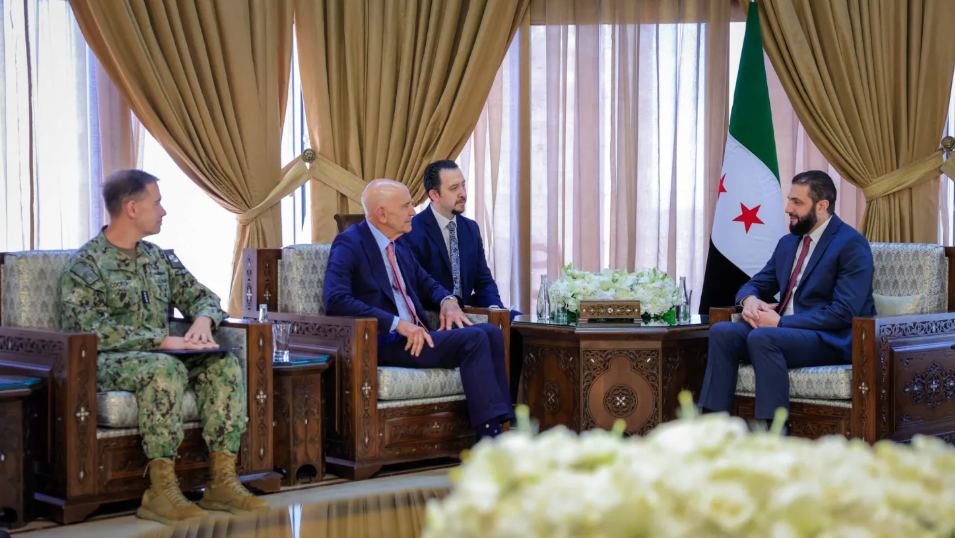 Ammon News - Syrian interim President Ahmed al-Sharaa received in Damascus on Tuesday US Special Envoy to Syria Tom Barrack and Commander of the US Central Command Brad Cooper for talks on the latest developments in the country and ways to support the political process.