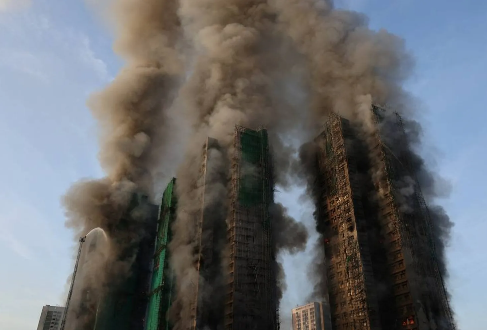 The raging fire sent up a column of flames and thick smoke as it spread on bamboo scaffolding that had been set up around the exterior of the complex in the city’s Tai Po district. Live video from the scene showed firefighters aiming water at the intense flames from high up on ladder trucks.
