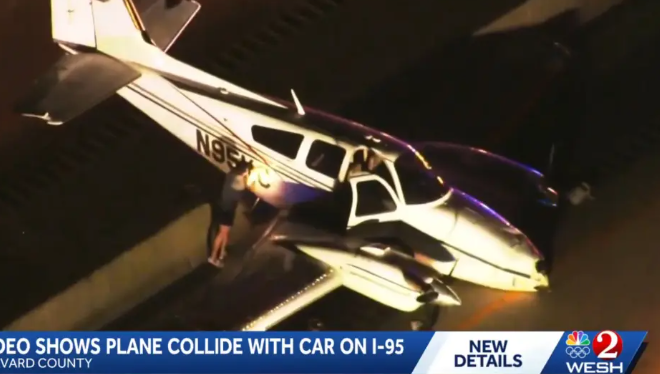 The “fixed-wing multi-engine aircraft” crashed into car in the southbound lane of I-95 in Cocoa, Fl. around 5:45 p.m. Monday, the Florida Highway Patrol said.