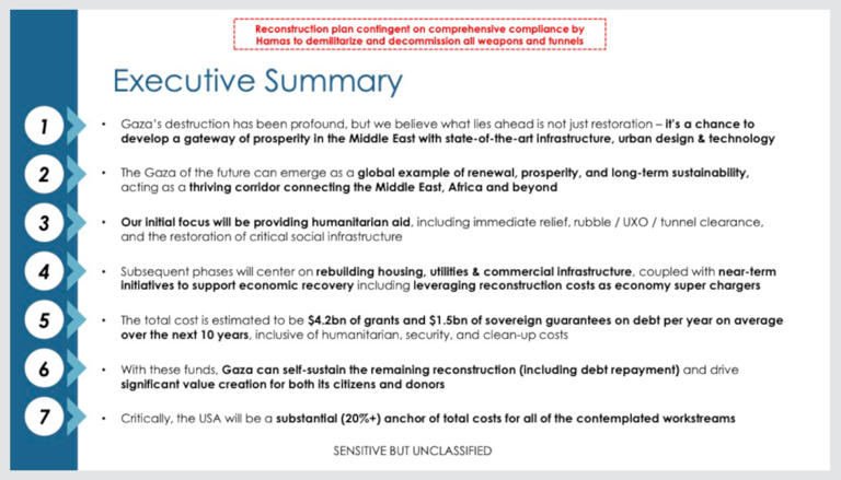 In 32 pages of PowerPoint slides, replete with images of coastal high-rises alongside charts and cost tables, the plan outlines steps to take Gaza residents from tents to penthouses and from poverty to prosperity.