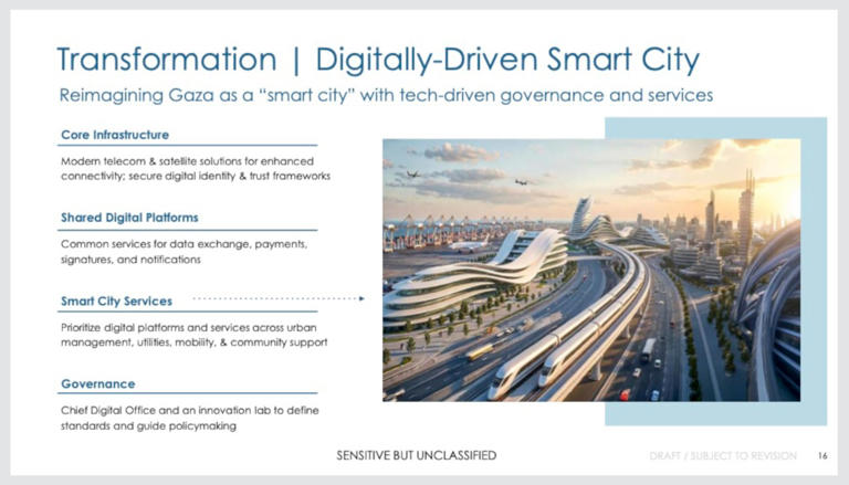 The presentation is labeled “sensitive but unclassified,” and doesn’t go into details about which countries or companies would fund Gaza’s rebuilding. Nor does it specify where precisely the 2 million displaced Palestinians would live during reconstruction. The U.S. has shown the slides to prospective donor countries, U.S. officials said, including wealthy Gulf kingdoms, Turkey and Egypt.