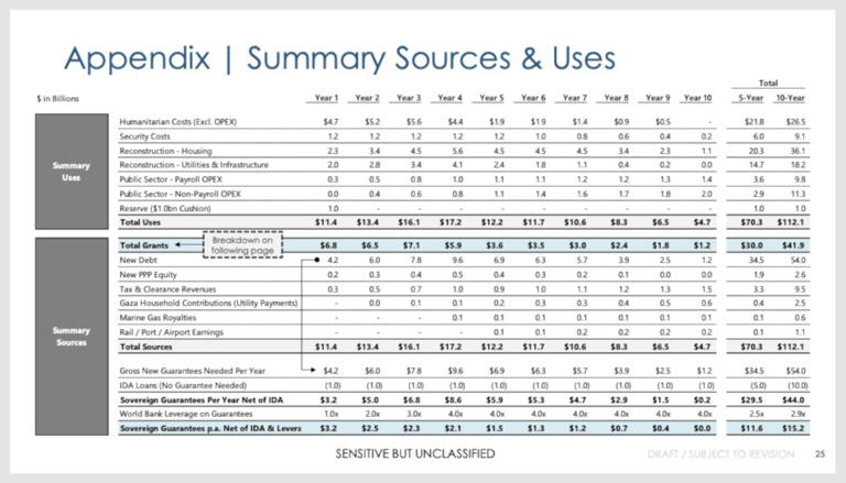 The project, according to the draft, would cost a total of $112.1 billion over 10 years, though the U.S. would commit to being an “anchor” supporting nearly $60 billion in grants and guarantees on debt for “all the contemplated workstreams” in that time period. Gaza could then self-fund many projects over the following years of the plan, the proposal projects, and eventually pay down its debt as improvements fuel local industry and the broader economy.