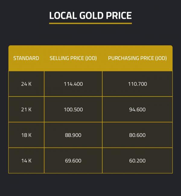 The selling prices per gram for 24-karat, 18-karat, and 14-karat gold were JD114.10 JD 88.90, and JD69.60, respectively.