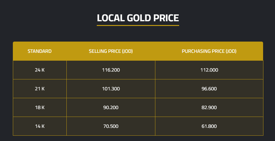 The selling prices per gram for 24-karat, 18-karat, and 14-karat gold were JD116.20, JD90.20, and JD70.50, respectively.