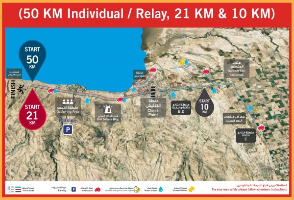 Roads leading to the race routes will be closed starting from midnight on Friday (12:00 AM) until 1:00 PM. The road after Rama traffic lights toward the Baptism Site triangle will be closed in one direction starting at 12:00 AM. The road from the Baptism Site triangle toward the hotel area up to Amman Tourist Beach will be closed starting at 2:00 AM.