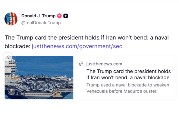 Ammon News - The US president, Donald Trump, has not yet formally commented on the breakdown of peace talks with Iran in Islamabad. But he just shared a link in a post on his Truth Social platform, to an article titled “The Trump card the president holds if Iran won’t bend: a naval blockade”.
