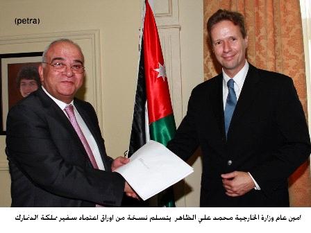 Amman, (Petra)--Secretary General of the Foreign Ministry Mohammad Ali Al Thaher on Tuesday received the credentials of newly appointed non-resident Danish Ambassador to Jordan Rolf M. Hay Pereira Holmboe.