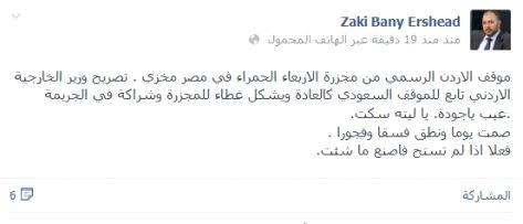 'Jordan's official stance towards the Red Wednesday massacre in Egypt is shameful.. shame on you Judeh,' Bani Ershead wrote.