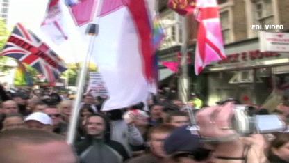 At a rally outside the Israeli Embassy in London on October 24, supporters of the English Defence League march through the streets waving flags and the red and white cross of St. George, chanting: "I'm England 'til I die!"