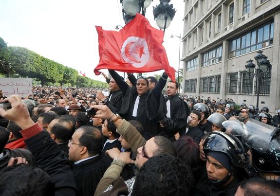 * January 14, 2011 Demonstrators shout slogans in front of the Interior Ministry in Tunis after Tunisian President Zine el-Abidine Ben Ali's address to the nation. Ben Ali said he would not seek another term in office and ordered police to stop firing on protesters as he sought to quell mounting unrest. Later, Prime Minister Mohammed Ghannoushi went on state television to announce that he is assuming power.