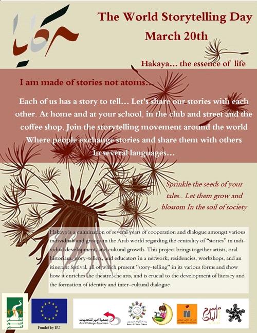 The campaign will urge all people on that day to share their stories at home and school and in the streets and cafes- by "sprinkling the seeds of stories around so that they grow and blossom in the soil of the society"- which will make them become part of a world movement in which they share their stories in different tongues with others around the world. 'Hakaya' network aspires to regain appreciation of the tales and stories and a movement in this area of activity, either at local or regional and Mediterranean levels.