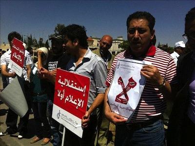 The protesting journalists and political activists on Friday called on the government to stop its "aggressive harassment" against journalists, and wondered "how they [the State Security Court] ignored the king's orders to release Fazzaa’, and refused bailing him."