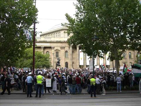 The many speakers in who offered their thoughts and views on the calamity that Israel's attempt to neutralize Gaza included Kim Bullimore, Michael Shaik, Mohammad Nimer, Edmond Melki, Sheikh Isa Musa, Tansim Samah, Taimor Hazou, Dr Richard Middleton, and Riyad Al Adassi who is visiting from Gaza's. Finally, Jody Betzin, from the Australian/Venezuelan Solidarity Network read a short speech received from the Venezuelan Embassy sent from President Hugo Chavez's office. These speeches took place at the State Library and then at Federation Square.