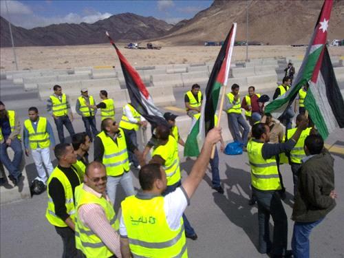 Ammon News - AMMONNEWS - About 150 workers of a logistical services company in Aqaba went on open strike on Monday, blocking a main highway in southern Jordan and causing a major traffic jam in an attempt to shed light on their labor demands.