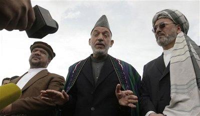 Photo: Afghan President Hamid Karzai, center, speaks to media as his first vice president Mohammad Qasim Fahim, left, and his second vice president Karim Khalili are seen with him following his registration at the election commission office in Kabul, Afghanistan on Monday, May 4, 2009. (AP Photo/Musadeq Sadeq)