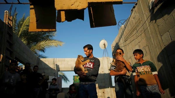 Ammon News - On the roof of an apartment block in one of Gaza’s most crowded cities, two lion cubs prowl among the water tanks and dine on slaughtered chickens as children take selfies.
