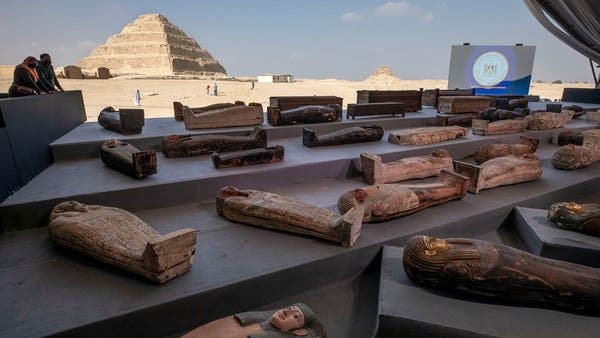 Colorful, sealed sarcophagi and statues that were buried more than 2,500 years ago were displayed in a makeshift exhibit at the feet of the famed Step Pyramid of Djoser at Saqqara.