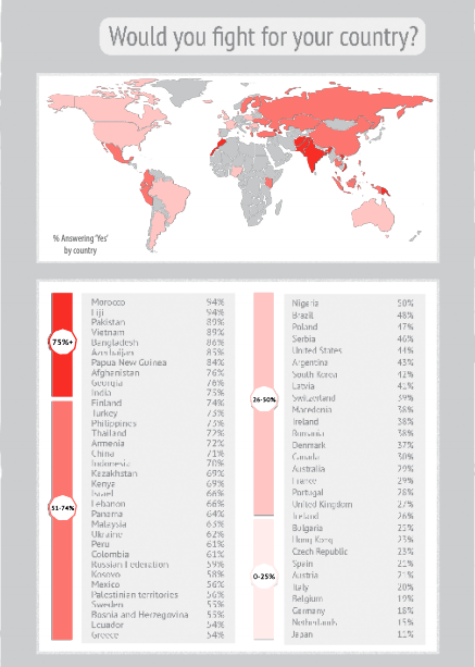 The country with the highest percentage of people who say they would fight for their homeland is Morocco. It is an Arab country, but it is not in the Middle East. Part of why Moroccans feel so overwhelmingly patriotic is because the Moroccan state has existed since the Idrisid dynasty in the 8th century, and has existed under various dynasties since then. Compare this with the other two Arab states, Lebanon and Palestine. They have a big percentage of people willing to fight, but nowhere close to Morocco’s. There just isn’t a historical foundation for “Lebanon” and “Palestine” in the context of a culturally separate and independent state, so the incentive to fight is not as high. Turkey, Israel, Armenia, Georgia and Azerbaijan are the other nations within this general area of the world, and all of them rank higher than Lebanon and Palestine. They are built upon the concepts of their dominant ethnicity and not random borders, and their nations are far older, leading to more patriotism. Suppose there was one Levantine or Arab state; a bigger commitment to statehood would exist because there would be a more sufficient context, emotion or idea for which to fight. If these artificial borders affect how many people would take up arms for Lebanon and Palestine, it surely affects how many people participate in Civil Society in Lebanon and Palestine, how many people vote in Lebanon and Palestine and do their best to better Lebanon and Palestine.