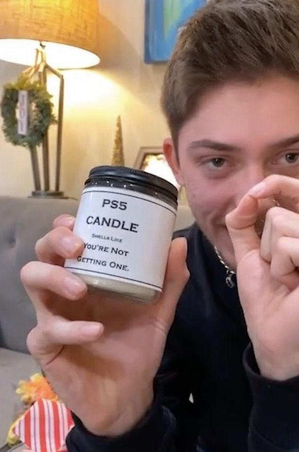 He does and on the front is a label which reads: "PS5 CANDLE.