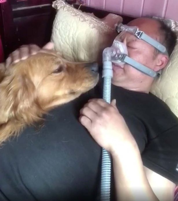 A golden retriever was filmed refusing to leave his sick owner's side as he slept using a ventilator for the first time.