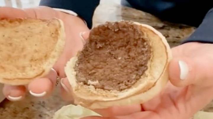 The bun has hardened and they have a difficult time pulling apart the bread to look inside, but when they do they find the patty doesn't look too bad.