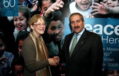 * Foreign Minister Nasser Judeh shakes hands with UNRWA Commissioner General Karen AbuZayd at a conference of host and donor countries at the Dead Sea on Wednesday (AP photo by Mohammad Abu Ghosh)