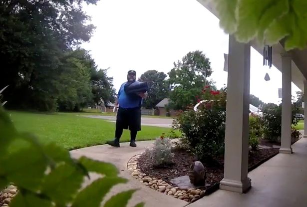 A doorbell camera catches the moment the takeaway worker walks towards the front door carrying the pizzas in one hand and a drink bottle in the other, when he stops to read a handwritten note which had been left on the front door.